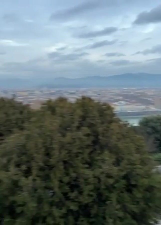 panoramic view of Florence, Italy, from a high vantage point. The city is nestled against a backdrop of hazy mountains under an overcast sky. The Arno River snakes through the city, reflecting the soft light. Several iconic landmarks, including the Duomo and the Palazzo Vecchio, are visible on the skyline. A road runs across the foreground, where several people are walking and standing. Green bushes and trees are on either side of the road. The overall impression is of a calm, slightly hazy day overlooking a historically rich and vibrant city.