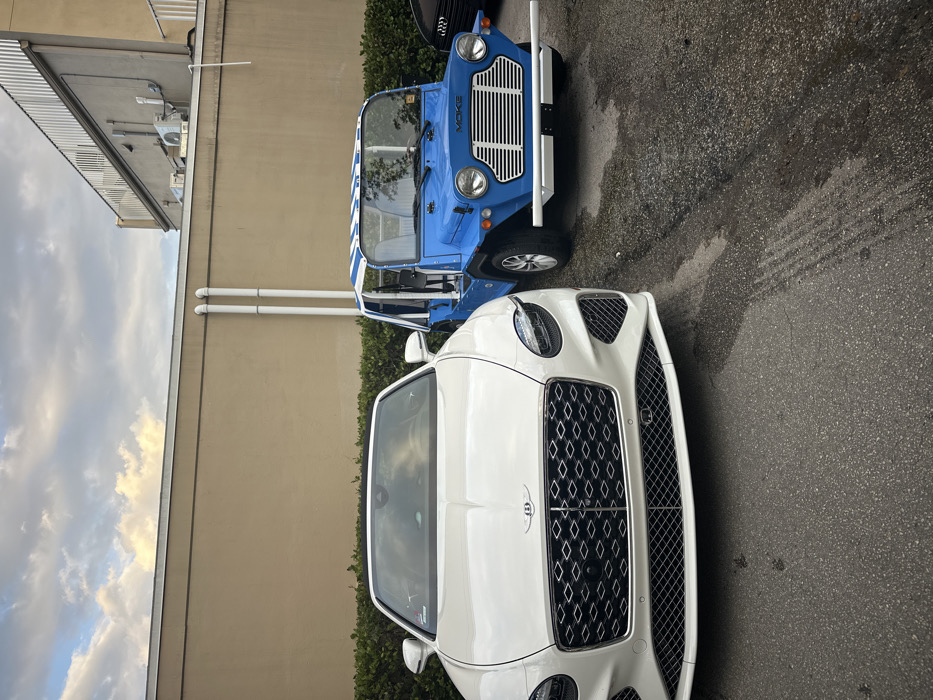 The image displays an outdoor parking scene in Naples, Florida, featuring two primary vehicles under a cloudy sky. A white Bentley Continental GT convertible is parked prominently on the left, its front grille, headlights, and badge clearly visible, facing forward. To its right, a bright blue Moke electric vehicle is positioned, characterized by its open-air design, circular headlights, white front grille, and a white-and-blue striped soft top canopy. A third, dark-colored vehicle with a partial grille is partially visible behind the Moke on the far right. The vehicles are parked on a dark asphalt surface exhibiting tire marks and wet patches. In the background, a light tan building wall spans horizontally, with a line of dense green hedges at its base. Two white vertical pipes are affixed to the tan wall. Above and to the right of the Moke, a taller section of the building is visible, featuring HVAC units on its exterior and a metallic, possibly corrugated, barrier along its roofline. No individuals are present in the scene.