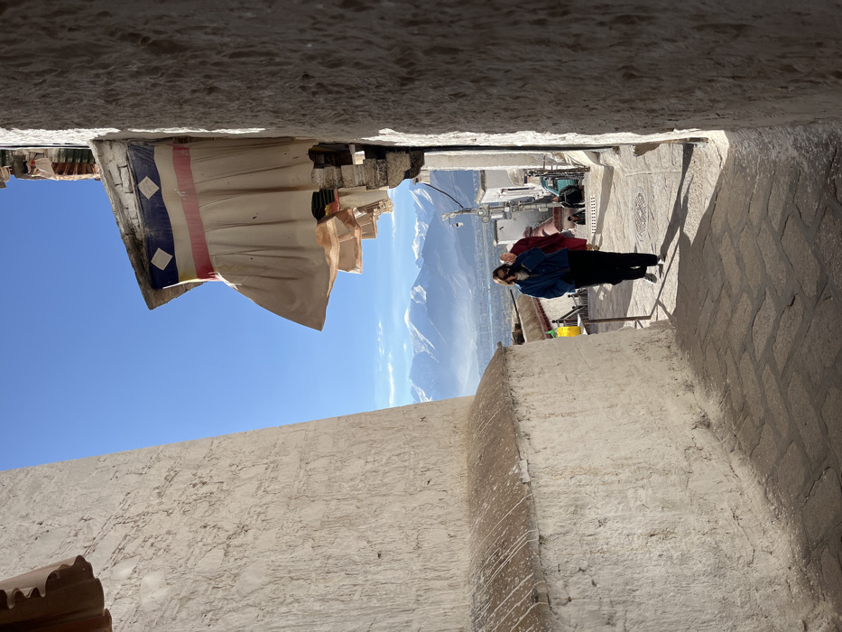 The image displays a sunlit outdoor scene within a narrow, descending pathway framed by two rough, off-white plastered walls in Chengguan District, China. The pathway, paved with light-colored interlocking stones, slopes downward towards a wider vista. A solitary individual, dressed in a dark blue jacket, dark trousers, and light-colored shoes, wearing sunglasses and a dark face mask, walks away from the viewer on the path, positioned slightly left of center. Behind this person, a figure in a dark red robe, indicative of monastic clothing, is visible also descending. Further down the path, multiple indistinct figures are present on a series of steps. To the right, an architectural overhang extends from a building, featuring decorative support structures and multiple layers of light-colored fabric drapes. Directly beneath the eave, a banner displays horizontal stripes of blue, white, red, and white, accented by a dark diamond-shaped emblem. To the left, a low, thick white wall, possibly a parapet, exhibits streaks of discoloration. In the background, under a clear blue sky, a panoramic view reveals snow-capped mountains in the distance, partially veiled by atmospheric haze at their base. Below the mountains, a city or town is discernible. A black street light pole stands in the mid-ground. A yellow container and a dark railing are visible on the left side of the path, near the initial descending slope. Strong sunlight creates pronounced shadows on the pathway.