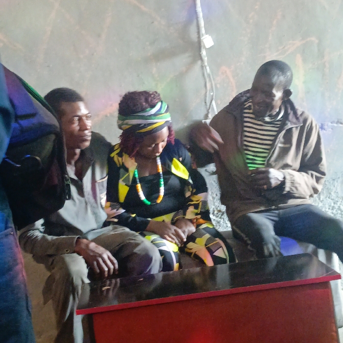 The scene is located in Dong, Nigeria, as specified. It depicts three individuals seated indoors against a rough, grey wall. In the foreground, a dark rectangular table with a red trim is visible. The ambient lighting is dim, characterized by colored artificial light sources casting green, blue, purple, and red hues across the subjects and wall. From left to right: A male, partially obscured on the far left, is dressed in a light-colored long-sleeved shirt and trousers, directing his gaze towards the right. Next to him sits a female with red-tinted hair partially covered by a striped headwrap featuring green, yellow, and white patterns. She wears a black top, a geometrically patterned skirt, and a multi-colored beaded necklace, with her head tilted downwards. To her right, a second male, wearing a striped shirt beneath a brown zipped jacket and dark trousers, is captured mid-gesture with his right hand raised, exhibiting a slight facial expression as he looks towards the center. Electrical wires are visible on the wall behind them.