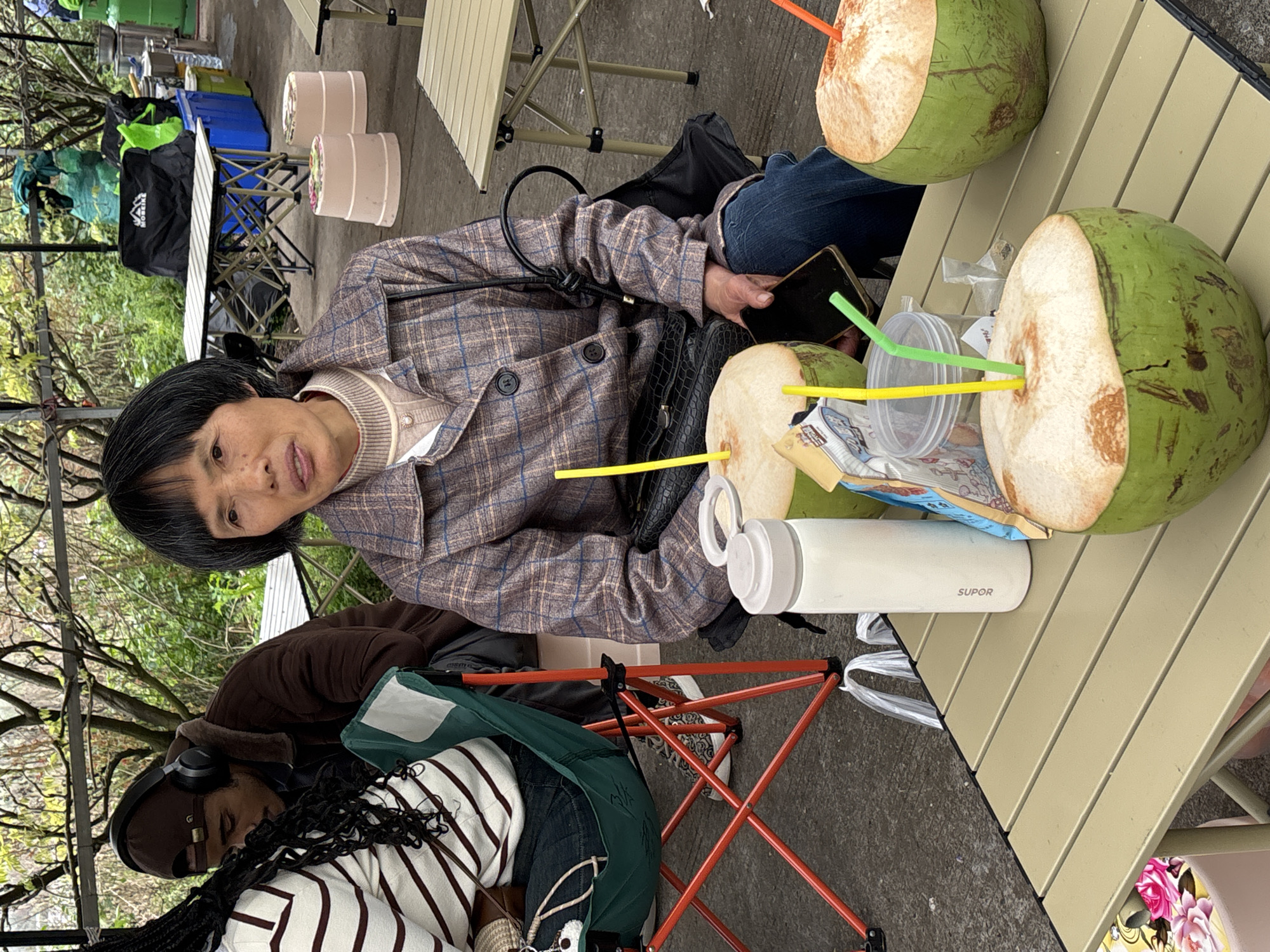 The image depicts a woman with short black hair wearing a plaid jacket and blue jeans sitting at a tan folding table outdoors. She is holding a black smartphone and has a black purse on her lap. On the table are three halved young coconuts with straws, a clear plastic cup with straws, a white thermos bottle with "SUPOR" printed on it, and snack wrappers. A person with long braids wearing a striped shirt and headphones is partially visible in the lower left corner. In the background, there is foliage, camping equipment, and more folding tables. The location is Xianfeng, China.
