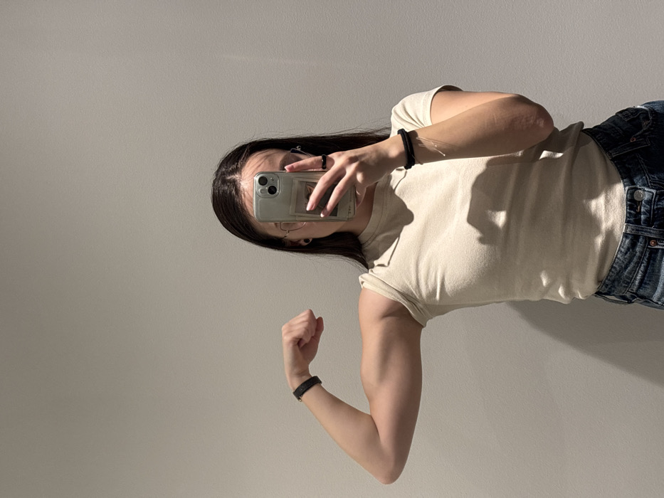 The image displays a female subject positioned indoors against a plain light gray wall. The subject is taking a mirror selfie with a light-colored smartphone, held in her right hand, which partially obscures her face. She wears spectacles and has dark hair parted centrally. Her left arm is flexed, showcasing the bicep. She is attired in a light beige, short-sleeved top and blue denim jeans. A black wristband is present on her left wrist, and a black hair tie or similar band is on her right wrist. The scene is located in Copenhagen, Denmark.