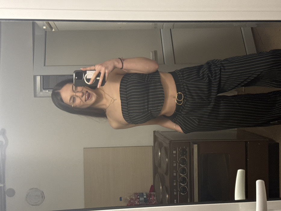 An indoor mirror selfie depicts a young adult female located in Buhovo, Bulgaria. She possesses long, dark hair and wears clear-framed eyeglasses. Her attire consists of a black pinstriped strapless crop top and matching wide-leg pants secured by a gold double-ring belt buckle. Multiple gold necklaces are visible, along with a silver ring on her left index finger and dark string bracelets on her left wrist. Her left hand is positioned in a pant pocket. She is actively taking the photograph with a black smartphone, held in her right hand, while her tongue is extended. The reflected background on the viewer's left reveals a dark brown freestanding electric stove with four visible burners and an oven, topped by a plastic water bottle with a blue label and a red fabric item. A light-colored rectangular panel is mounted on the wall above the stove. On the right side of the reflection, a white interior door with a visible handle and frame is present against a light-colored wall. A white door handle is also visible in the immediate foreground, indicating the mirror's mounting surface.
