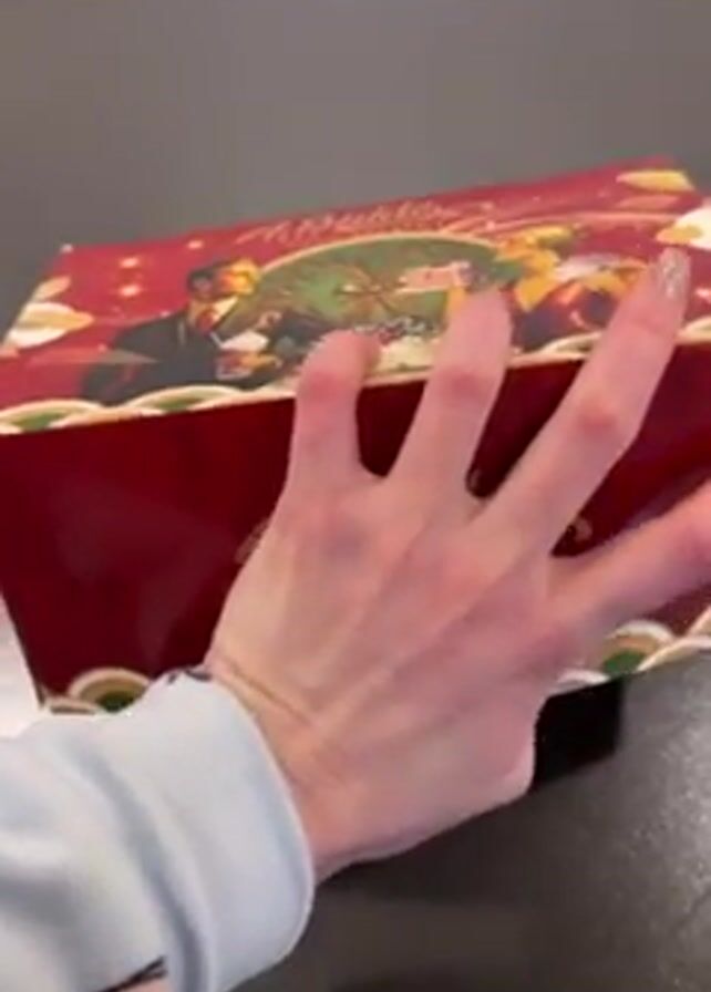 A person opens a red rectangular box labeled "A. Blikle" on a gray surface. Inside are four round pastries, presumably donuts, each with a different topping or filling. One has a dollop of yellow cream, another is sliced in half revealing yellow cream, and two have white frosting with orange pieces.