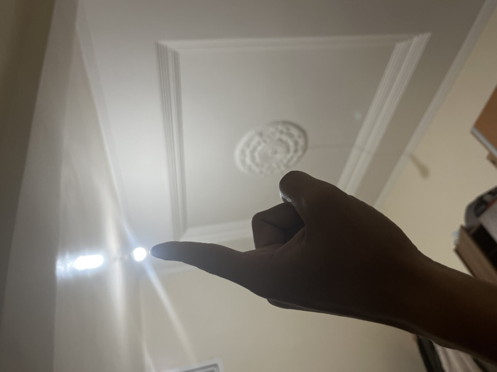 An upward angled view showcases a ceiling with a square recessed design, decorated with a circular flourish at its center. A hand, silhouetted against the lighter background, is prominently displayed in the foreground. The index finger extends towards a bright point of light reflected on the wall, creating a contrast between the dark hand and the luminous spot. The surrounding walls and other objects are softly visible, creating an ambiance with subtle light and shadow interplay.