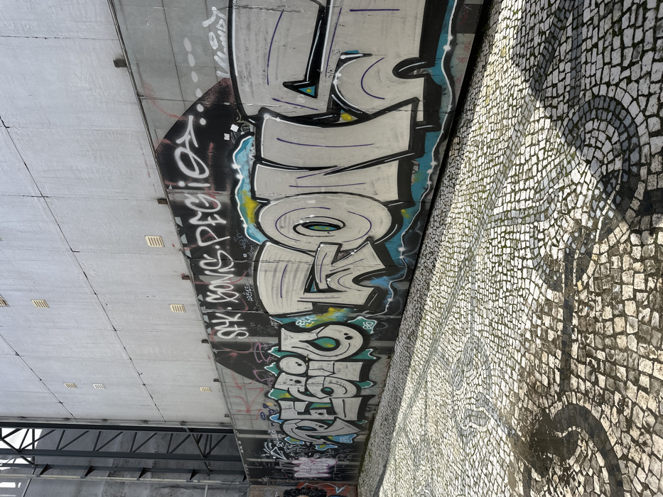 The image displays an urban scene in Aveiro, Portugal. No individuals are present. The foreground features a traditional Portuguese cobblestone pavement, or 'calçada portuguesa,' consisting of light-colored, square-cut stones forming decorative, dark curvilinear patterns. Strong shadows extend diagonally across the cobblestones from the left, along with several dark, wet-looking patches. A large, multi-sectioned wall dominates the background. The lower portion of the wall is a dark grey, segmented structure heavily covered in graffiti. This graffiti includes large, stylized block letters in light grey with black outlines and turquoise or light blue internal fills, prominently featuring text such as "REGGIO" and "PEGIO," alongside numerous smaller tags and scribbles. Above this graffiti-covered section, the wall transitions to a lighter grey, unadorned concrete-like surface with subtle horizontal seams and multiple rows of small, square, light-colored vents evenly spaced vertically. To the far left, a tall, dark metallic structural frame, possibly part of an adjacent building or support system, is visible against the upper wall section.