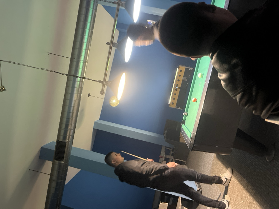 An indoor recreational facility in Dolno Osenovo, Bulgaria, is depicted, illuminated by multiple overhead light fixtures, including a three-lamp track light illuminating a green-felted pool table