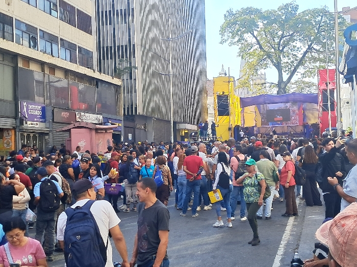 A large crowd fills a city street, converging toward a brightly colored stage set up in the distance. Tall buildings flank the street, one with distinctive vertical stripes. The crowd is diverse in age and attire, with many wearing backpacks. The event seems to be drawing a significant turnout, creating a lively atmosphere.