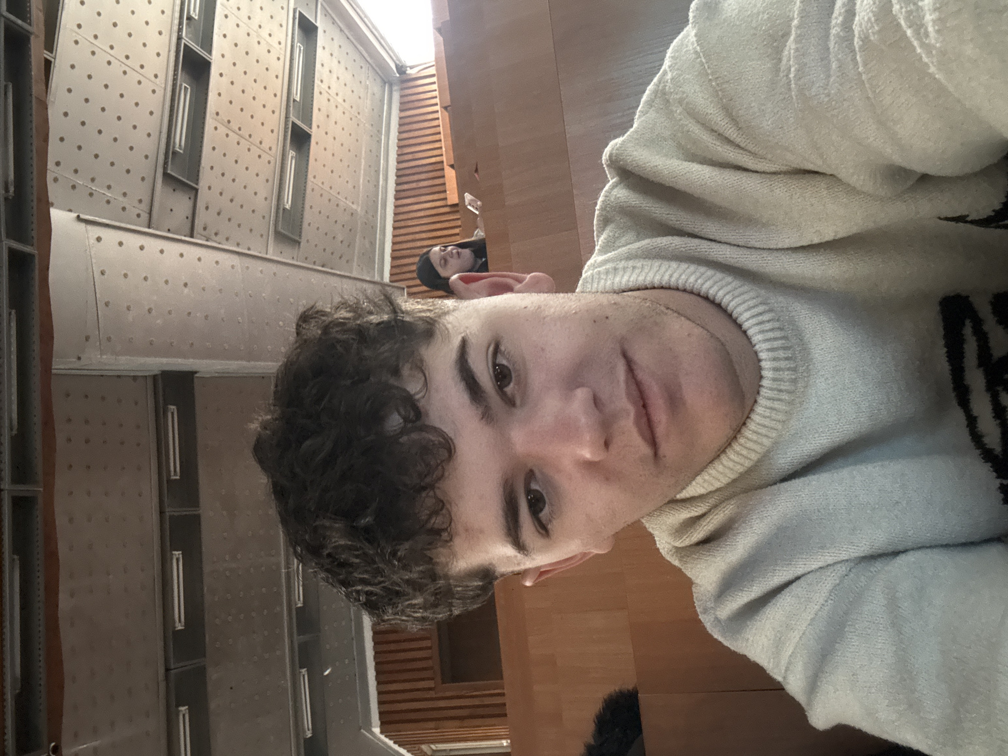 The image displays the interior of a tiered lecture hall, consistent with those found in a university in Sofia, Bulgaria. In the foreground, a male individual, appearing to be in his late teens or early twenties, with short, dark, curly hair and faint facial stubble, is depicted looking directly at the camera. He is wearing a light, possibly cream or off-white, knitted sweater with a rolled collar. In the mid-ground, to the right of the primary subject, a female individual with dark hair is partially visible, seated behind a light-brown wooden desk barrier. She is looking towards her right and holding a white-cased smartphone. The environment features multiple tiers of light-brown wooden desks and barriers, characteristic of educational seating arrangements. The upper walls behind the seating are paneled with vertical wooden slats. The ceiling is a suspended grid system composed of rectangular, perforated acoustic panels, with integrated rectangular fluorescent light fixtures. Visible white ventilation ducts or structural elements run across the upper portion of the ceiling. The lighting appears to be a mix of overhead artificial illumination and natural light entering from a bright area to the far right.