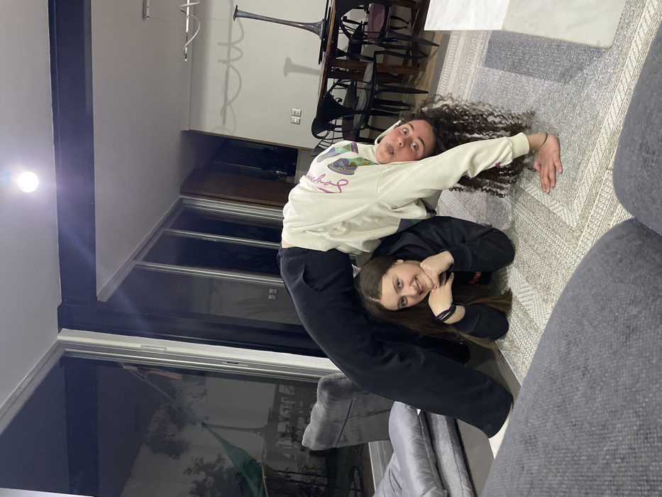 Two girls are playfully posing inside a modern house. One girl, wearing a white sweatshirt and black pants, is in a flexible backbend, resting her hands on a patterned rug. The other girl, wearing a black sweatshirt, lies beneath her, looking up and smiling. A large window reflects the exterior, and a couch partially frames the scene. Contemporary furniture and decor are visible in the background.