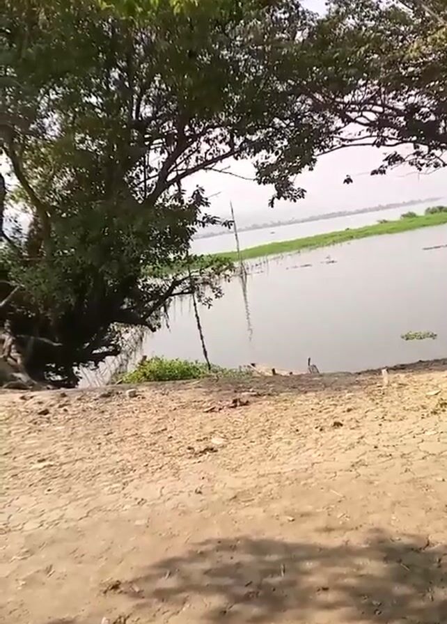 view of a calm lake or river from a sandy shore. Trees with green leaves are visible on the left and right sides of the frame, partially obscuring the view. A few small boats are visible on the water. The sky is overcast, and the lighting is somewhat muted. A dirt road is in the foreground, and shadows cast by the trees fall across it. The camera slowly pans to the right, revealing more of the lake and shore. No people are visible in the video.