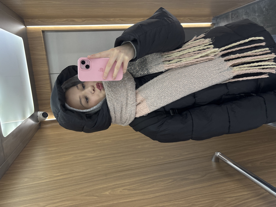 A young woman wearing a black puffer jacket with the hood up and a light-colored scarf is taking a selfie with a pink phone