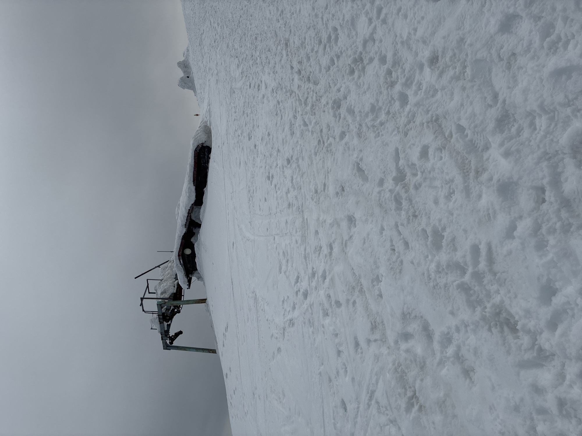 snow-covered landscape in Bistritsa, Bulgaria. A metal structure, possibly part of a ski lift, stands against a steep, snow-covered incline. The sky is overcast. There is no evidence of people.