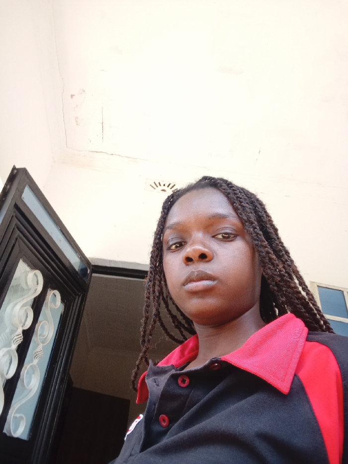 The image depicts a female individual in a medium-shot portrait, positioned centrally and facing directly towards the camera. She has dark skin and her hair is styled in thin braids. She is wearing a black polo shirt with a red collar and red accents on the shoulders, featuring red buttons on the placket. To the left of the individual, a dark-framed doorway, possibly black metal or painted wood, is partially visible and slightly ajar. The door's panel contains a light-colored, ornate scrollwork pattern. The background primarily consists of a light-colored (off-white/cream) ceiling or overhead structure, showing signs of wear including minor cracks and some discoloration. A small, circular, dark ventilation grate or light fixture base with radiating lines is visible on the ceiling above the individual's upper right. A window with light blue panes is partially visible in the upper right corner of the frame, behind the individual. The scene is located in Mahiakalo ward, Kenya.