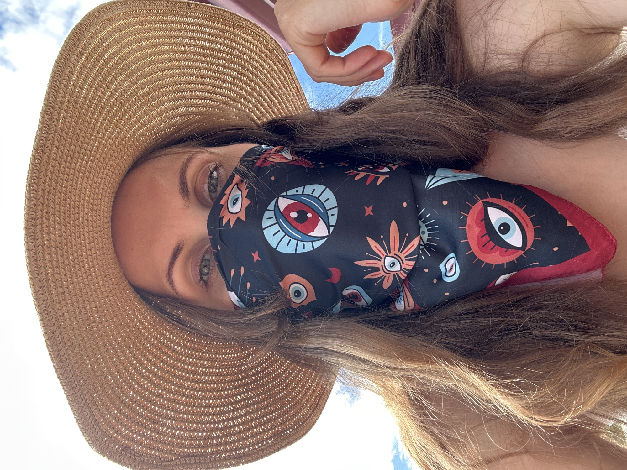 A woman in Fethiye, Turkey, is seen from a low angle, possibly a selfie, wearing a large straw hat and a dark face covering with eye-like designs. Her long, light brown hair flows down her shoulder. She has visible green eyes. The sky is visible in the background.