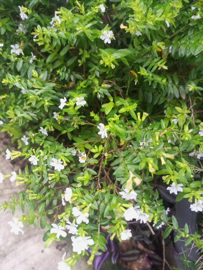 The scene is located in Bamhori, India. The image provides a close-up, overhead view of a dense, flowering shrub, consistent with *Cuphea hyssopifolia*. The plant occupies the majority of the frame, exhibiting numerous small, elongated oval to lanceolate leaves of bright to medium green coloration. Scattered throughout the foliage are abundant small, white, five-petaled flowers, measuring approximately 5-8mm in diameter, along with some light yellow or cream-colored buds. The stems are thin and woody, largely obscured by the dense leaf and flower growth. The lower left portion of the image reveals a light grey, textured surface, possibly concrete or pavement. In the lower right, dark areas consistent with soil or shadows are visible, along with fragments of dark-colored plant containers and broad, dark purple leaves from another plant situated beneath the main shrub. The environment appears to be outdoors under natural, diffuse lighting conditions. No individuals, animals, explicit actions, or interactions are present.
