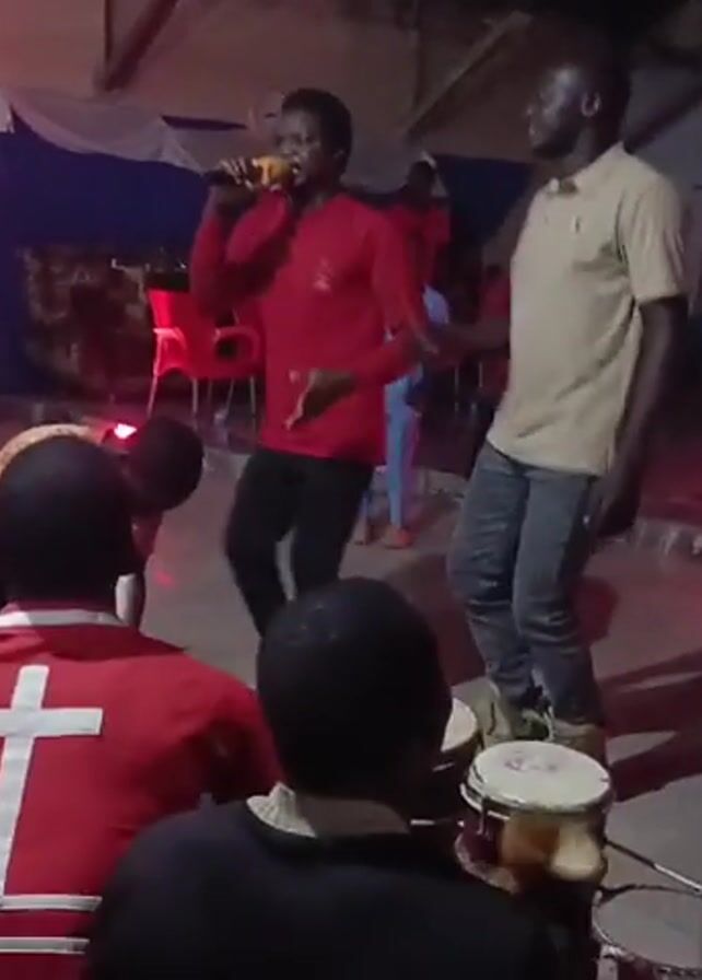 The video captures a lively church gathering, likely a youth service or special event, taking place indoors. A young man in a red shirt is energetically leading the group in song with a microphone, joined by another man in a tan shirt who appears to be dancing. A drummer sits on the floor, providing musical accompaniment. Several other individuals, some in red shirts with a white cross on the back, are seated or standing around. The backdrop is decorated with white and blue cloth. The general atmosphere is energetic and filled with music.