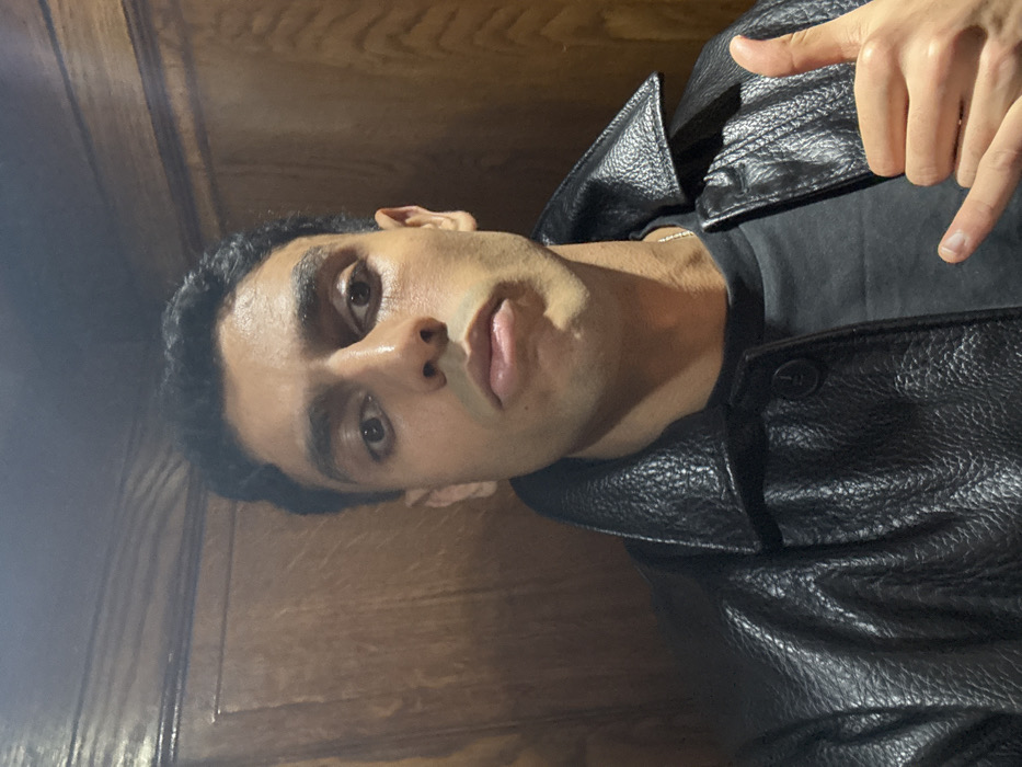 A light-skinned man with dark hair and eyes looks toward the camera, wearing a black leather jacket over a dark t-shirt. Part of his hand is visible, making a "hang loose" gesture. The backdrop appears to be a wooden surface with lighting that creates a lens flare.