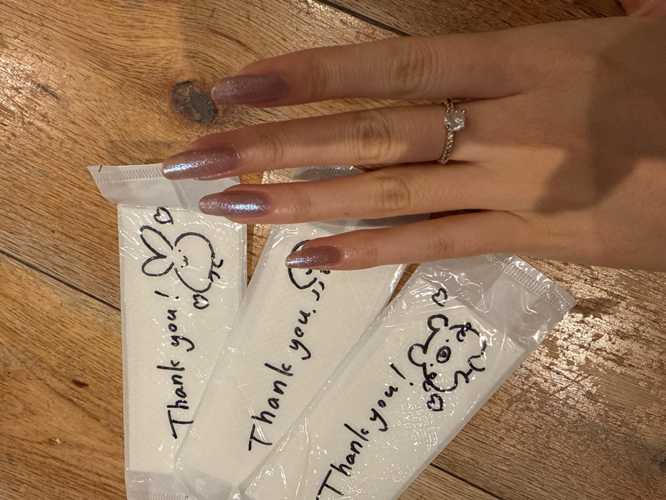 A human left hand, featuring long, iridescent light purple nail polish on all visible fingers, is positioned over three individually wrapped white items on a wooden surface. A ring with a gold-toned band adorned with small clear stones and a prominent oval-cut clear center stone is worn on the fourth finger of the hand. Each of the three rectangular items is sealed in clear plastic, enclosing a white material, and bears the handwritten inscription "Thank you!" in black ink. The topmost visible package includes a simple line drawing of a rabbit with hearts, while the lowermost visible package displays a similar drawing of a bear or hamster with hearts. The underlying surface is made of wood, exhibiting a distinct grain pattern and varying shades of medium brown. The scene depicts a common amenity found in hospitality settings, such as a cafe or restaurant. No specific architectural landmarks or unique environmental identifiers are present to precisely pinpoint a particular location within Yokohama, Japan.