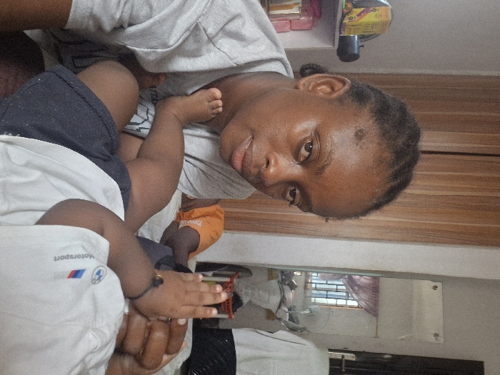 A woman with braided hair is holding a baby. The woman wears a gray shirt and looks at the camera. The baby wears a white shirt with a "Motorsport" logo and navy shorts. The baby's tiny hand holds onto the woman's hand. A small black bracelet adorns the baby's wrist. The setting appears to be a room with light-colored wooden furniture and a mirror reflecting a window.