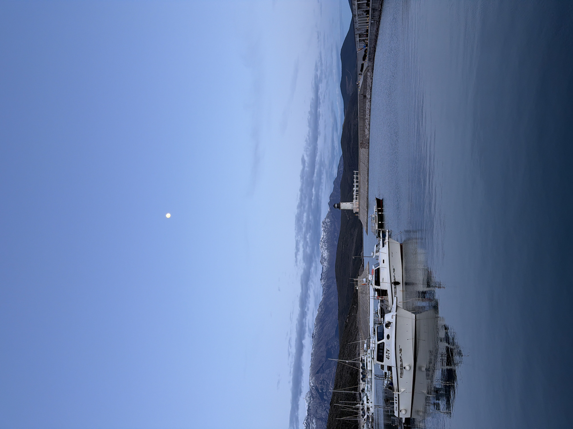 harbor in Radovići, Montenegro, at dusk. The sky is a gradient of light to dark blue with a visible moon. In the center, boats are docked along a stone quay. Mountains, partially covered with snow and clouds, rise in the background. The water in the harbor is calm, reflecting the boats and sky.