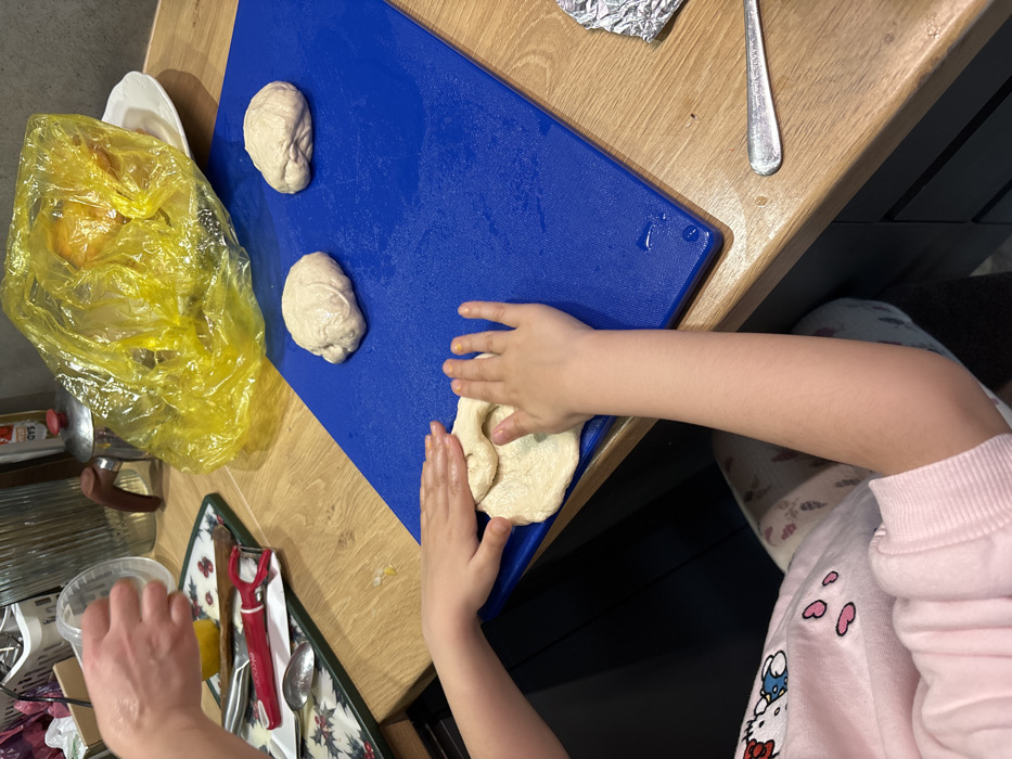 This image depicts an indoor kitchen environment in Haskovo, Bulgaria, showcasing a food preparation activity. The central focus is a child's hands, belonging to an individual wearing a pink long-sleeved top with a white graphic, actively pressing and shaping a piece of light-colored dough on a blue plastic cutting board. Two additional rounded portions of raw dough rest on the same board, which exhibits moisture droplets. To the upper left, an adult's hands hold a clear plastic container lid above a white and green patterned placemat displaying a red-handled vegetable peeler, a silver spoon, and a yellow lemon. The primary work surface is a light-brown wooden countertop. In the background, a silver kettle with a brown handle, a crumpled yellow plastic bag, and a partially visible white plate are present. Dark kitchen cabinetry forms the lower background. A crumpled piece of aluminum foil and a silver spoon are situated on the lower right portion of the countertop. The scene illustrates a collaborative dough preparation activity.