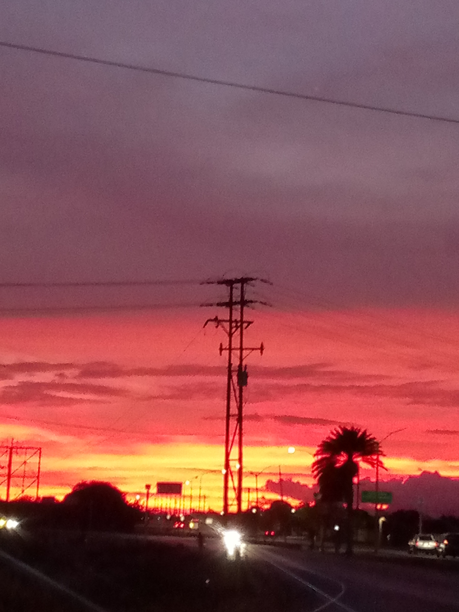 The image depicts a sunset scene, likely in El Dátil, Venezuela. A utility pole stands prominently in the middle ground against a backdrop of a vibrant, red-orange sky transitioning to a purplish hue. A road stretches across the foreground with vehicles traveling on it, evident from the headlights. Silhouetted trees and other vegetation are visible along the roadside. In the midground, other utility poles, street lights, and a palm tree are discernible. The overall scene suggests a suburban or semi-urban environment at twilight.