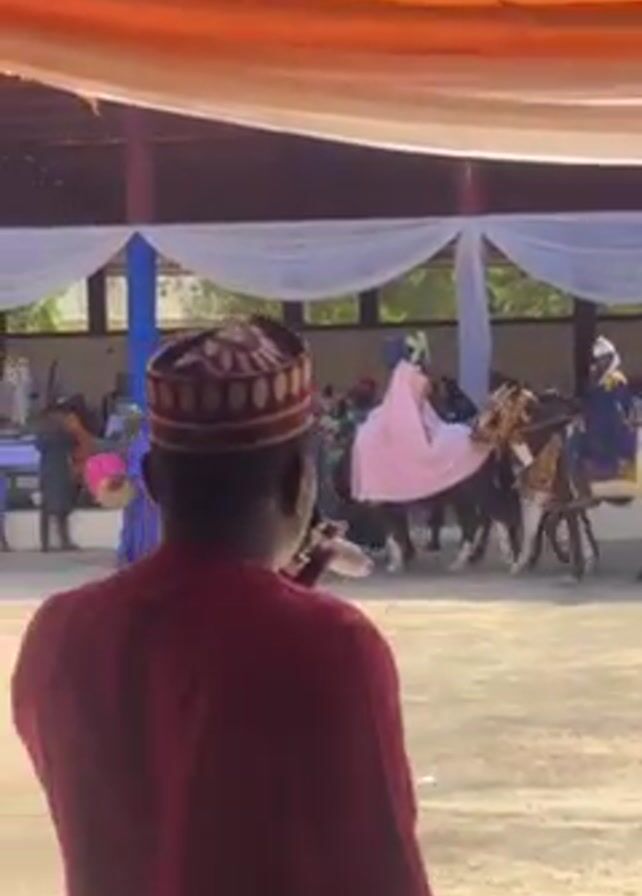 man wearing a dark red shirt and a traditional hat in the foreground, with his back to the camera. In the background, a colorful cultural event is taking place. There are people dressed in traditional robes and hats, some on horseback. One person is wearing a pink dress. There are white and orange canopies overhead. A group of people appear to be playing musical instruments and dancing. Some people are sitting and watching. The environment looks like an outdoor arena or courtyard.