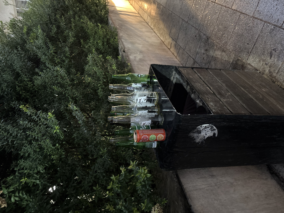 The scene, located in Rehovot, Israel, depicts an outdoor public area at night, illuminated by artificial light. A dark-colored recycling or trash bin, featuring a reflective top and slatted wooden sides, stands on a paved sidewalk. On its top surface are approximately 10-12 empty glass beverage bottles, predominantly clear Corona beer bottles and green beer bottles (likely Heineken), alongside one orange aluminum can with multi-fruit imagery. A faded circular marking is visible on the bin's left side. Behind the bin, a dense wall of dark green foliage rises from a low concrete barrier. The paved sidewalk, composed of grey tiles, extends to the right, reflecting warm artificial light and appearing damp. A partial view of a light-colored building with horizontal blinds is visible through the foliage in the upper right. No individuals, active actions, or direct interactions are observed.