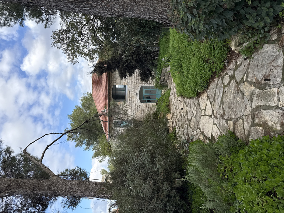 A stone house with a red tile roof stands amidst lush greenery. A paved stone pathway leads to the house. Trees frame the view, partially obscuring the blue sky with fluffy white clouds. The house has a window and a turquoise door. Various plants and shrubs create a natural, garden-like setting. The stone pathway appears to be bordered by more greenery.