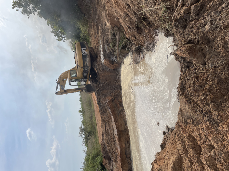 An excavator, branded "CAT," sits near a muddy pool within a deep, freshly dug trench