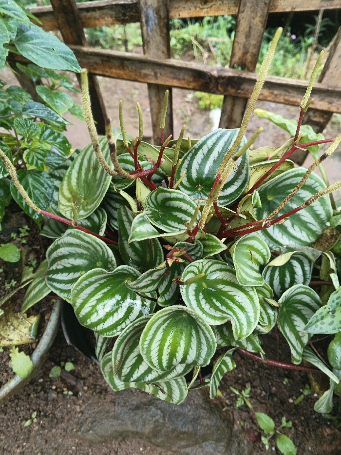 - "This image presents a close-up, top-down view of a vibrant Peperomia argyreia plant, commonly known as Watermelon Peperomia, located in an outdoor garden setting in Bien Hoa, Vietnam" by FM-8Yrvl1, licensed under CC BY 4.0