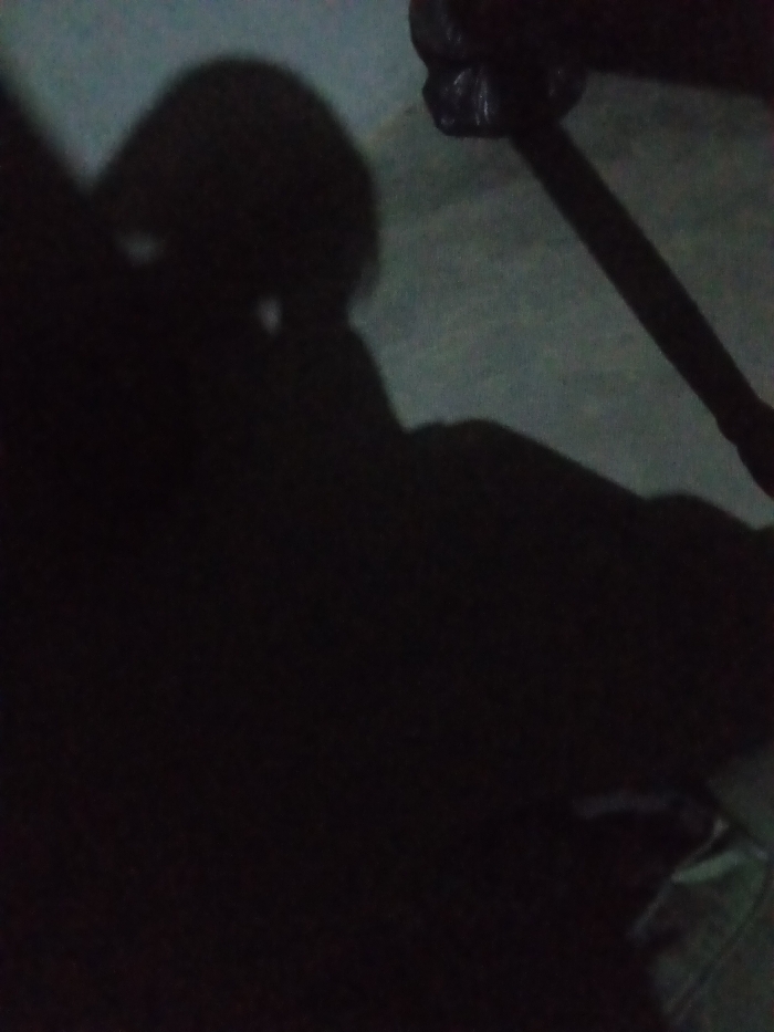 dark and obscured scene, dominated by deep shadows. The general shape suggests a person seated, with only the silhouette of their head and shoulders visible. There's a hint of what might be a hand holding a dark object resembling a cane or stick. The background is indistinct, possibly a concrete or rough surface. The overall composition evokes a sense of mystery and obscurity.