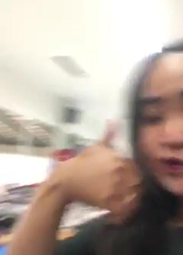 A woman with dark hair, wearing a dark-colored shirt, is facing the camera and gives a thumbs-up. She is in an office environment with a desk visible in the background. She gestures towards a computer monitor displaying a white screen and a blue shirt with a logo on the desk. The room has white walls and a light-colored ceiling. The woman then rests her hand on her forehead.