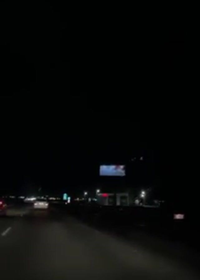 The video depicts a night drive on a highway. The camera appears to be mounted inside a car, providing a driver's perspective. Other cars are visible on the road, their headlights and taillights illuminating the dark environment. A large billboard stands beside the road, and the scene is illuminated by intermittent streetlights. The road is marked with white lines, indicating lanes. The sky is completely dark.