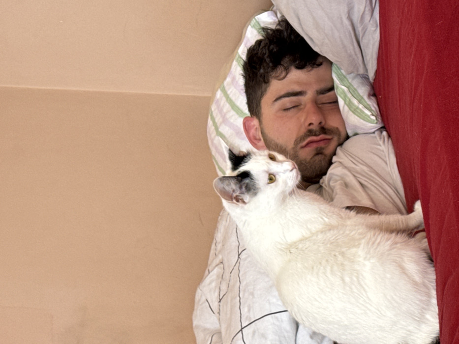 The scene is an indoor setting, likely a bedroom. A male individual with dark, curly hair and a beard is observed lying on his right side on a bed, appearing to be asleep. His head rests on a pillow with green, white, and light purple stripes. He wears a light-colored shirt. Adjacent to him, a white domestic short-haired cat with distinct black markings on its left ear and top of its head, and yellow eyes, sits upright on the red bedspread. The cat is looking to its right, seemingly observing the area near the man's head. The bed is covered with a white duvet featuring sparse black line patterns and a solid red blanket. The background consists of plain light orange-brown walls. No specific features are present to identify a precise location within Sofia, Bulgaria.