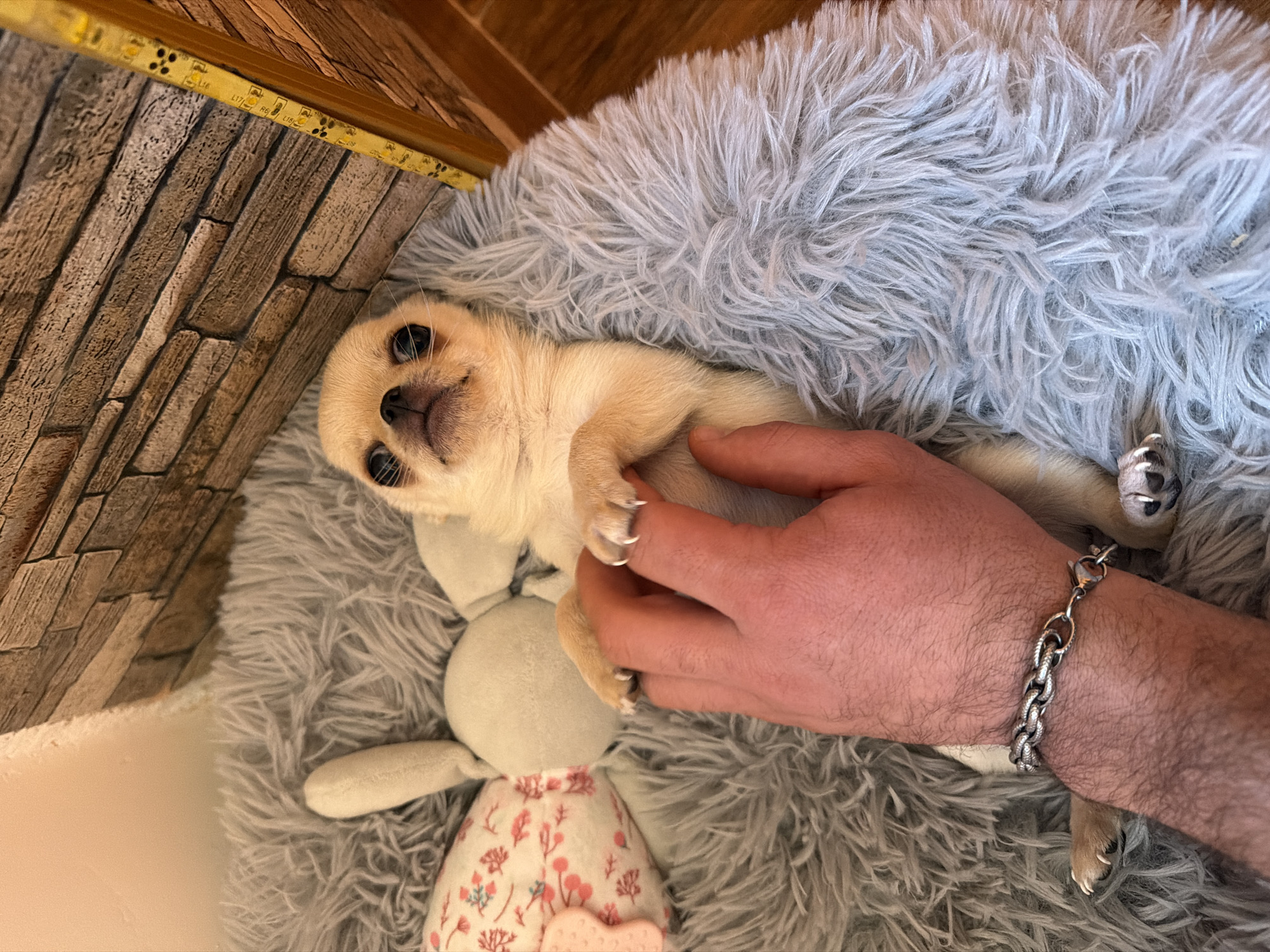 The scene depicts an indoor setting, identified as a residence in Vrabevo, Bulgaria. A fawn-colored chihuahua puppy is positioned on its back, resting on a light grey, shaggy faux fur pet bed or blanket. Its front paws are slightly raised. An adult human hand, appearing from the lower-left, interacts with the puppy, its fingers gently touching the puppy's right front paw area. The human's wrist bears a silver-colored, chunky chain-link bracelet. Partially visible to the left of the puppy is a stuffed animal, possibly a rabbit, featuring a white body and a pink-and-white floral pattern on parts of its fabric. The background includes a wall decorated with a brown and grey stacked-stone or brick pattern. To the far right, a vertical wooden beam or panel is visible, with a yellow LED strip light affixed to its edge, displaying circuit markings.