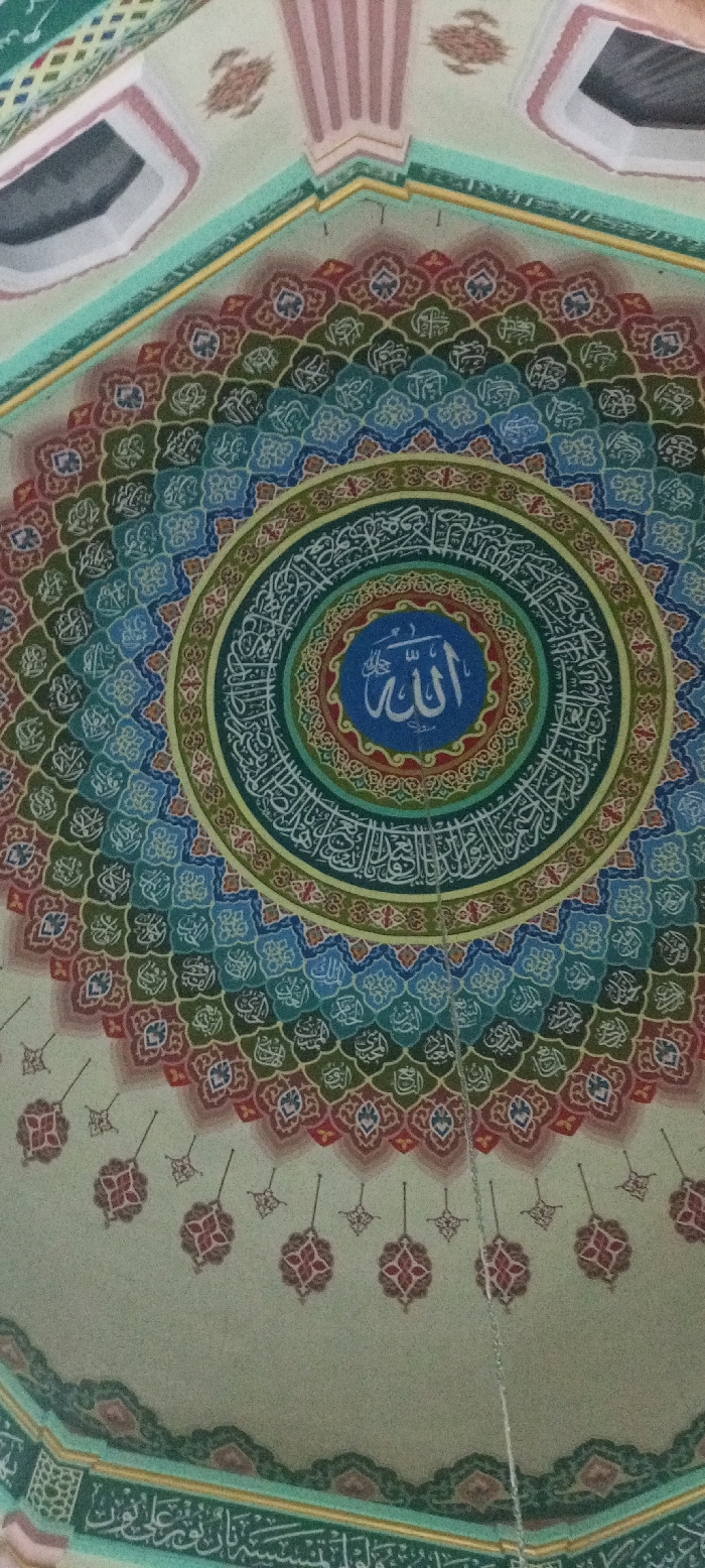 The image showcases an ornately decorated dome, likely within a mosque