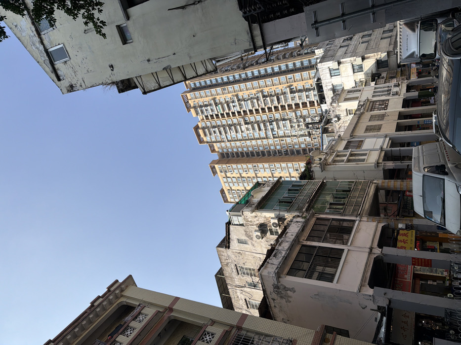 - "A worm's eye view captures the dense urban landscape, focusing on a composition of tall, varied buildings under a clear blue sky" by FM-VxeEv1, licensed under CC BY 4.0