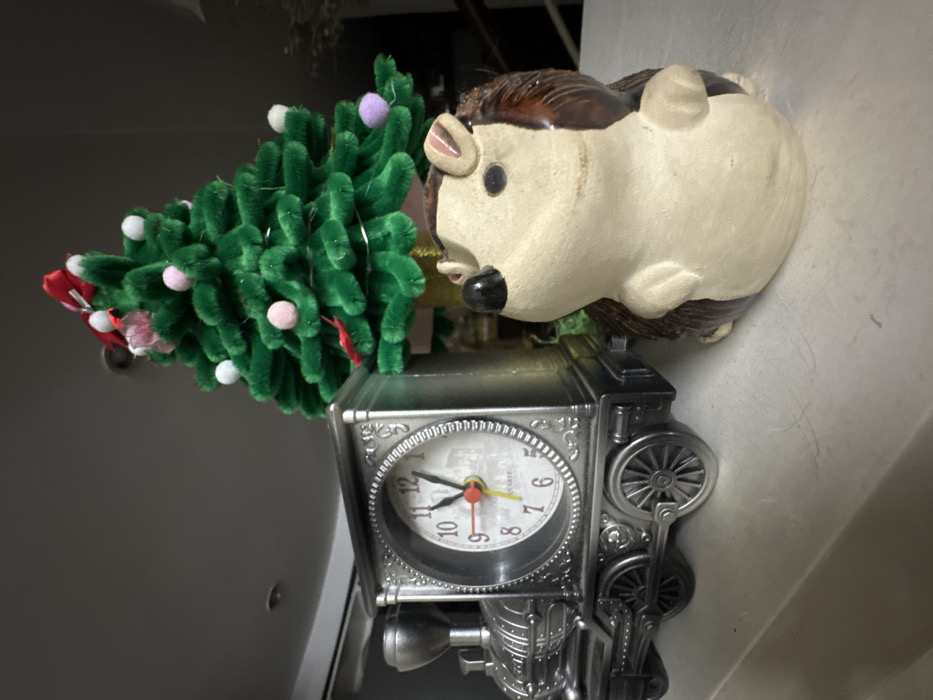 An indoor scene in Ho Chi Minh City, Vietnam, displays three decorative objects positioned on a light-colored surface. On the left, a silver-toned, locomotive-shaped alarm clock with a white face, black numerals, and red, yellow, and black hands indicates approximately 1:55. Centered behind the clock and to its right, a miniature green Christmas tree, constructed from fuzzy material, is adorned with small white, pink, and purple pom-poms, and a red bow at its apex. In the foreground on the right, a ceramic hedgehog figurine, beige on its frontal body and brown on its back, faces towards the left. The background consists of a plain, light grey wall. No individuals are present.