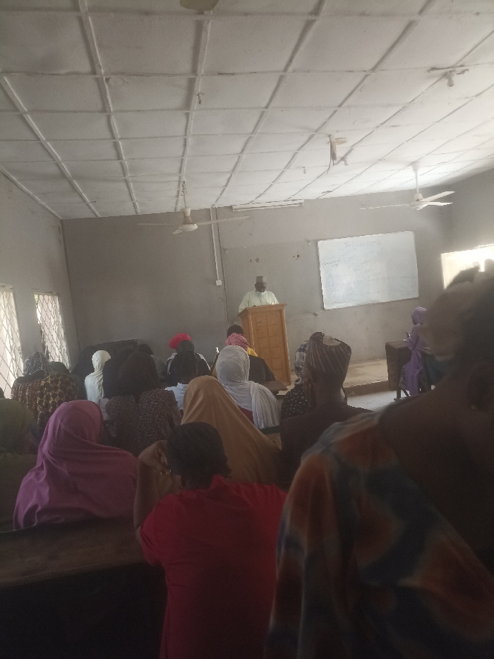 An indoor lecture or classroom setting is depicted in the city of Unknown, Unknown. A male individual, wearing a light-colored garment and a dark cap, stands behind a wooden podium at the front of the room, addressing an audience. Approximately 20-30 people, predominantly women, are seated in rows on wooden benches or desks, facing the speaker. Many audience members wear head coverings in various colors including pink, white, beige, and patterned fabrics. The room features light grey walls, a white grid-patterned ceiling with visible conduits, and three ceiling fans, two of which are in operation. A whiteboard with faint markings is mounted on the wall behind the speaker. Two windows with horizontal security bars are visible on the left wall. One audience member on the far right, wearing a purple garment, is observed looking down at a mobile phone.