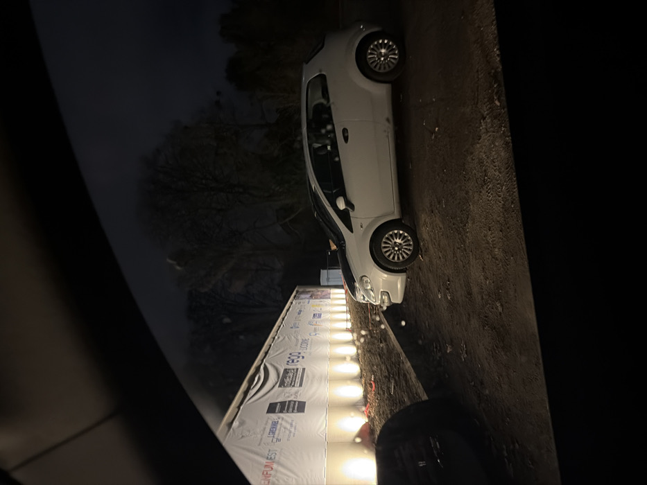 A white compact car is parked on a dark, unpaved surface. A lit-up structure with visible logos stands nearby, with multiple spotlights casting a glow. The scene is mostly dark, with some trees visible in the background. The photograph is taken from inside another vehicle, framing the view through a windshield.