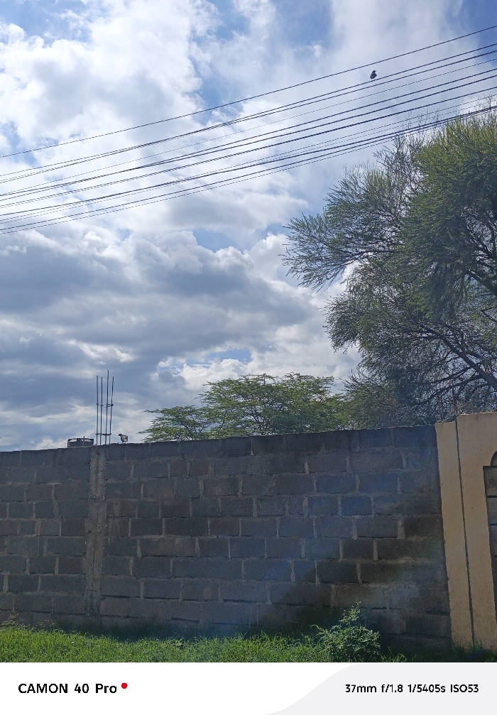 The scene depicts an outdoor environment in Nakuru, Kenya, under a partially cloudy blue sky. Approximately ten dark utility wires span horizontally across the upper portion of the frame. A single small, dark bird is perched on one of these wires in the upper right quadrant. Below the wires, a prominent grey concrete block wall extends across the midground. A light-colored bird stands on top of this wall, positioned towards the left. Behind the wall, to the left, three vertical rebar rods extend upwards, adjacent to a dark, cylindrical object, likely a water tank, also visible above the wall line. Further background foliage includes a sparse, light-green-leafed tree on the right and a denser, brighter green tree centrally located. The far right of the wall features a lighter-colored vertical pillar or gate post with a rectangular cutout. The foreground consists of green grass and small shrubs directly in front of the concrete wall.