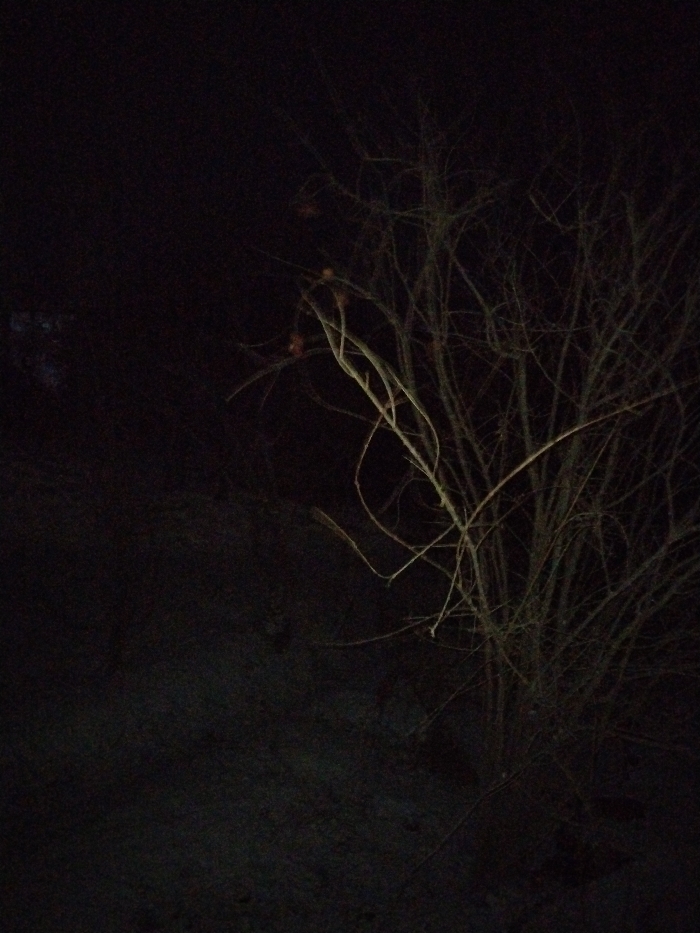 A night scene reveals a dense, leafless tree on the right, its branches reaching upwards. A few small, round objects appear to be clinging to the branches. The left side of the image is dominated by darkness, obscuring the ground and surrounding environment, save for a subtle texture suggesting vegetation or terrain. The overall mood is somber and indistinct due to the lack of light.