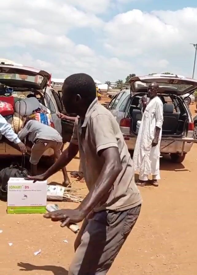 The video depicts a daytime outdoor scene in what appears to be a parking lot or open area with a reddish-brown dirt surface. Several cars with open trunks are visible, suggesting people are loading or unloading items. At least five individuals are present in the frame. One man, wearing a gray shirt and faded jeans, is in the foreground, bending and moving rhythmically as if dancing. Another man wearing a long white robe stands near one of the cars, and another man in a yellow and black shirt walks past. Other individuals are either loading items into the cars or standing nearby. A box labeled "LONART-DS" is on the ground. The sky is blue with scattered clouds. There is a light post with attached lights visible in the background.