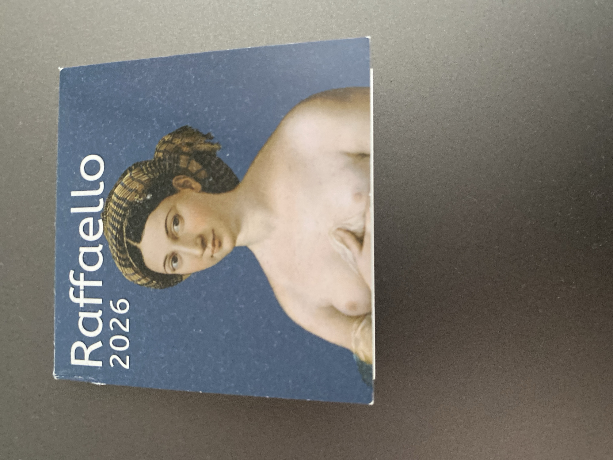 A square-shaped card is horizontally oriented on a flat, dark grey, speckled surface. The card displays a painted portrait of a light-skinned woman, depicted from the torso up, partially nude, with a neutral expression. She wears a brown and beige plaid headpiece over her dark hair, and her left hand is gently placed over her right breast. The background of the artwork is a solid blue. White text reading "Raffaello" is printed in the upper left corner of the card, with "2026" positioned directly below it. The image provides no visual information to determine a specific location within the city of Blagoevgrad, Bulgaria.
