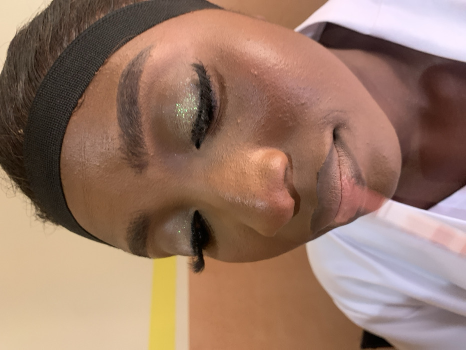 A close-up profile shot shows a Black woman's face. She wears a black headband. Her skin appears smooth and is accented by makeup. Her eyebrows are well-defined, and sparkly green eyeshadow adorns her closed eyelids. Her lashes are thick and long. Her lips are tinted with pinkish-nude color. Part of a white shirt appears on the side. The background includes a yellowish vertical stripe.