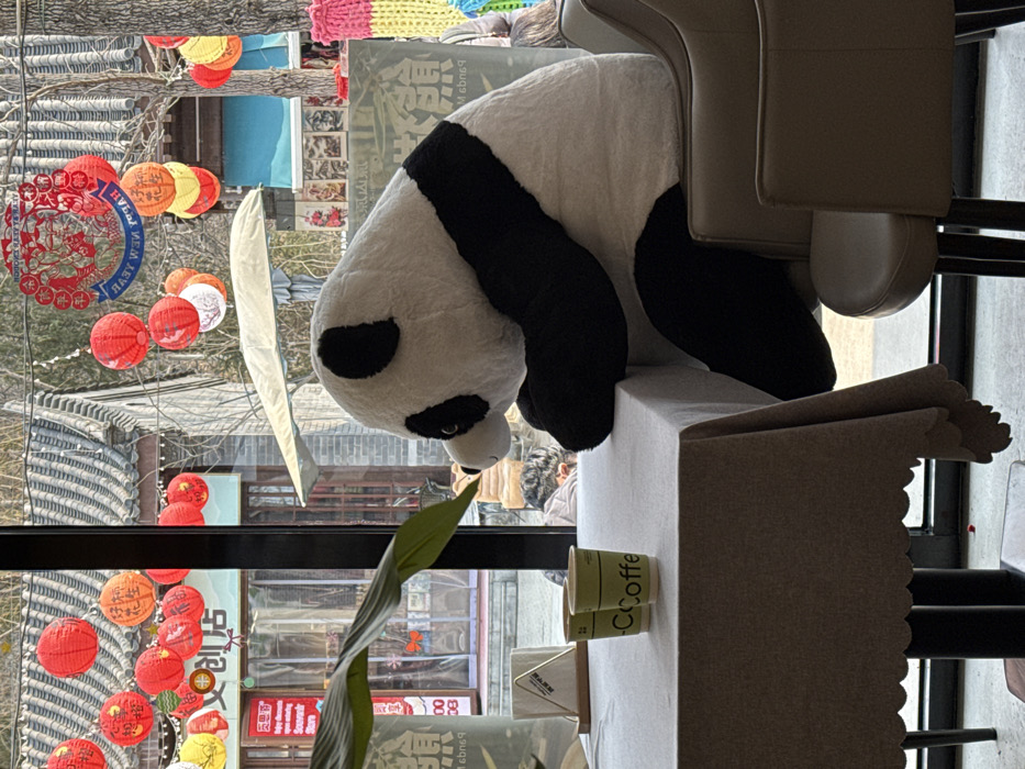 The image captures an interior view looking out through a large window onto a street scene in Huairou District, China. In the foreground, inside what appears to be a cafe or restaurant, a large panda mascot or plush figure is seated at a table, facing away from the camera and looking out the window. The panda is predominantly white with black ears, eye patches, and a black band around its torso, extending to its arms and legs. It is positioned on a light beige upholstered chair, with its arms resting on a light-colored, possibly white or cream-colored, tablecloth that features a scalloped edge at the bottom. On the table, to the left of the panda, are two light green disposable cups labeled "C-Coffee" in white text, alongside a napkin dispenser or menu stand. A large green leaf from an indoor plant partially obscures the extreme left foreground. Beyond the window, the outdoor environment displays traditional Chinese architecture with dark tiled roofs. The street is festively decorated with numerous red and orange Chinese lanterns suspended overhead. A large red circular decoration with gold accents and Chinese characters, likely a New Year or celebratory emblem, is visible in the upper right portion of the street scene. A storefront on the left features a red sign with Chinese characters "文创店" (cultural and creative store) and another sign indicating "Red Panda Cafe & Store." A light-colored awning is visible above an outdoor stall or seating area. Bare tree branches are scattered throughout the mid-ground. Faintly visible in the background are blurred figures of people. A colorful knitted or crocheted striped decoration is partially visible on the far right.