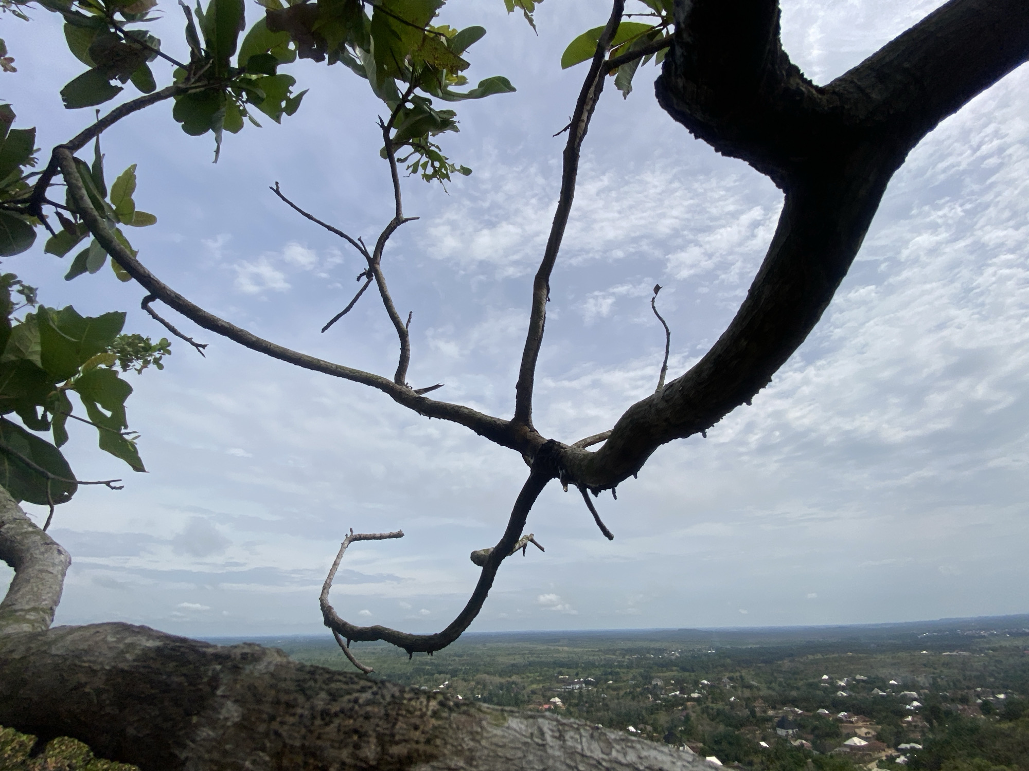 The image depicts a view of Achara, Nigeria, seen through the branches of a tree. In the foreground, tree branches with some green leaves frame the view. The background consists of a landscape with scattered buildings and green vegetation, indicating an urban and rural mix. The sky is overcast with light clouds. The image appears to be taken from a high vantage point, possibly a hilltop or elevated structure.