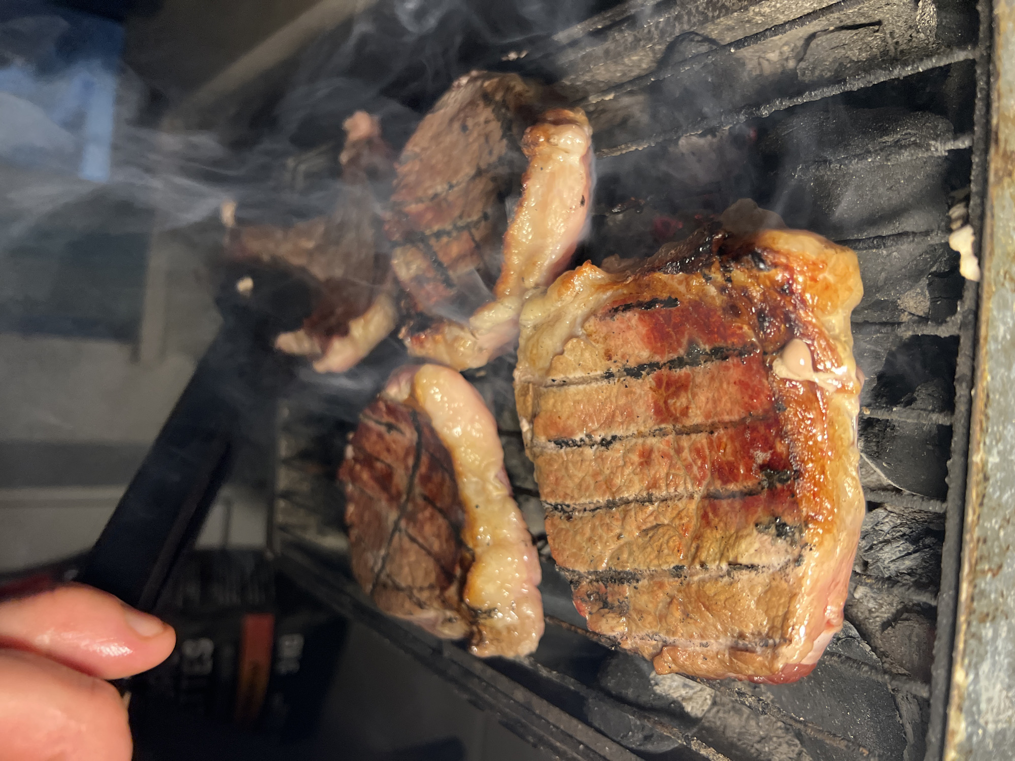 three pieces of meat grilling on a charcoal grill